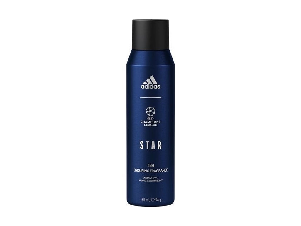 Deodorant ve spreji Adidas UEFA STAR oslavuje nejpamátnější fotbalové momenty aromatickým a svěžím složením. Okamžitá svěžest a dlouhotrvající vůně až 48 hodin.
