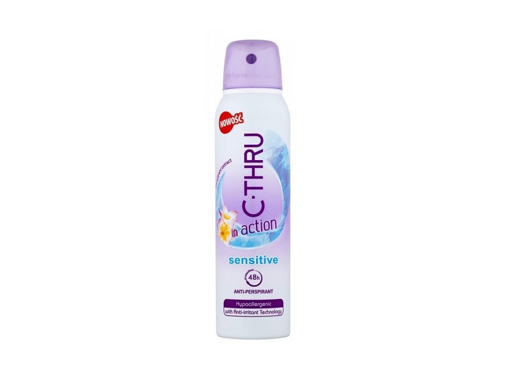 Antiperspirant C-Thru Sensitive poskytuje 48hodinovou ochranu proti pocení. Pomáhá chránit pokožku před podrážděním díky extraktu z květu Lei a složení SymRelief. Antiperspirant Sensitive je hypoalergenní a dermatologicky testovaný. Byl vytvořen za účelem minimalizace rizika alergických reakcí a tvorby bílých skvrn.