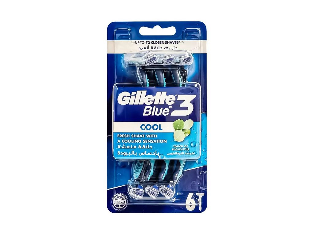 Gillette Blue 3 Comfort, vybavený trojicí nezávisle zavěšených chromovaných čepelí a pohyblivou hlavou, která kopíruje obrysy obličeje. Hlavice je potažena technologií, která je aktivována vodou. Chladivý pásek činí proceduru extrémně pohodlnou. Holicí strojek má netkanou pogumovanou rukojeť pro rychlé ovládání a břity, které se snadno oplachují.