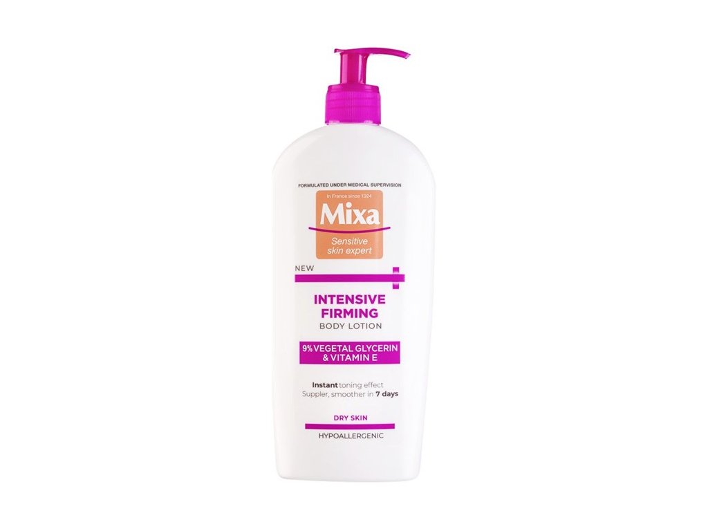 Mixa intenzivní zpevňující tělové mléko díky rychle se vstřebávající nemastné emulzi okamžitě zvyšuje elasticitu a tón pokožky. Zlepšuje pevnost a zanechává pokožku viditelnější a hladší. Glycerin posiluje kožní bariéru, udržuje vlhkost a vitamin E zmírňuje projevy stárnutí, navrátí pokožce pružnost a pevnost.