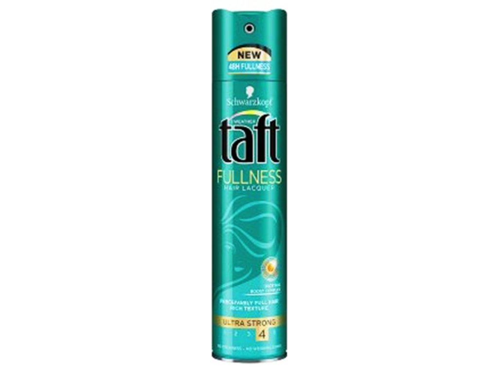 Taft Fullness je ultra silný lak na vlasy pro viditelně plnější účes, bohatou texturu vlasů a dlouhotrvající styling po celý den. Jeho inovativní receptura s Biotin & Boost komplexem udržuje dlouhotrvající fixaci a bohatou texturu vlasů až na 48 hodin..